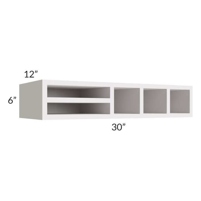 Organizer cabinet with wood veneer edge banding and a finished interior. There will be 2 horizontal shelving areas on the left which measure approximately 11-1/8"W x 2"H, and 3 vertical storage areas on the right which measure approximately 5-1/4"W x 4-3/4"H.