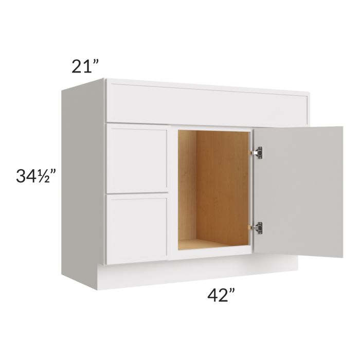 Vanity sink and drawer base combo cabinet with (1) 17-1/2" wide door in the middle, (1) 6-3/4" high false drawer front across the top of the entire cabinet, and (2) 11-1/2" high drawers on the left and right. This cabinet will not have any shelves.