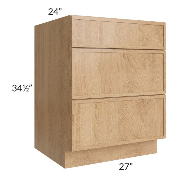 3 drawer base cabinet. Top drawer front is 6-3/4" high, middle and bottom drawer fronts are 11-1/4" high.