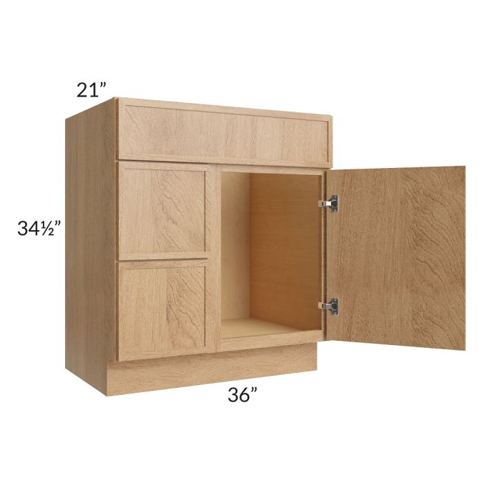 Vanity sink and drawer base combo cabinet with (1) 17-1/2" wide door on the right, (1) 6-3/4" high false drawer front across the top of the entire cabinet, and (2) 11-1/2" high drawers on the left. This cabinet will not have any shelves.Door is hinged on the right.