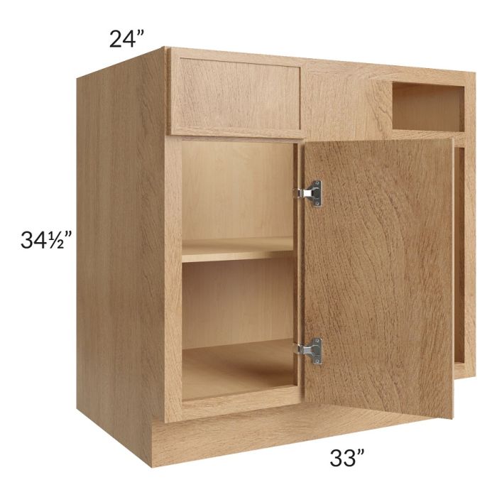 1 door blind base corner cabinet with 1 drawer and 1 shelf. The actual width is 33", but must be pulled at least 6-1/2" from the corner, taking up 39" of wall space. It can be pulled a max of 12-1/2", taking up 45" of wall space. The door width is 12-3/4", the stile width is 10-1/4" and the blind opening width is 9-3/4". A filler must be used between the blind and the adjacent cabinet so the doors and drawers are able to open without interference. The filler must be purchased separately. When selecting the blind location, it is as if facing the cabinet, if Left is selected, the blind will be on the left side of the cabinet and the door will be on the right side. The door will always be hinged on the side closes to the blind side of the cabinet (for example, a blind cabinet with the blind on the left side will have the door hinged on the left side as well). It cannot be hinged closest to the outside of the cabinet because it will restrict access trying to get in and out of the cabinet.