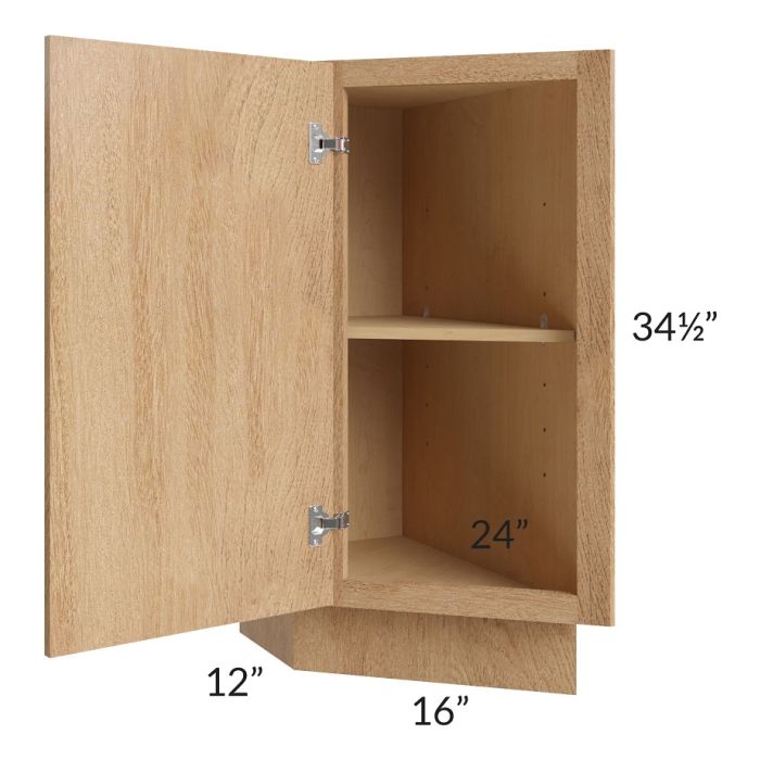 Full height door cabinet that is meant to be used at the end of a cabinet run. It will have a 24" deep side on the right which gets installed against the adjacent cabinet. The door is 16" wide and angled. The exposed side of the cabinet (on the left) will be 12" deep. The door will always be hinged on the 12" deep side.