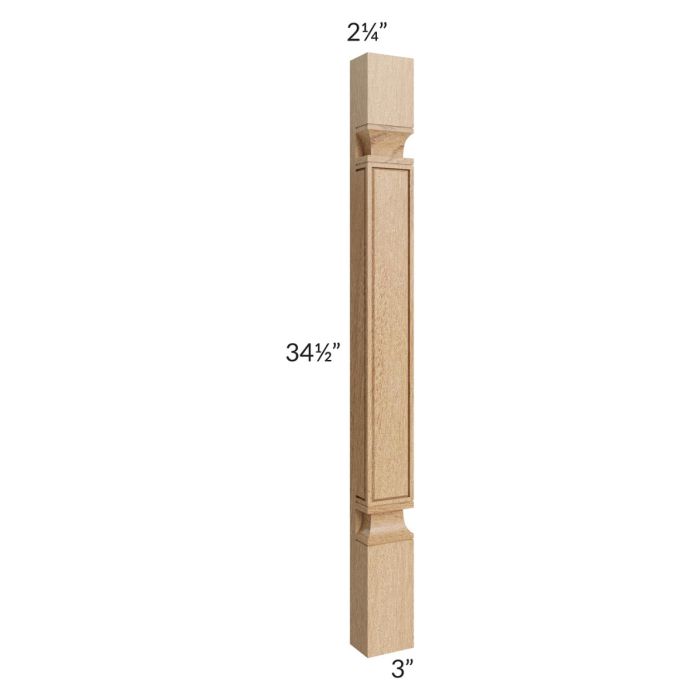 Base plain pilaster. The filler the pilaster is mounted on is 3/4" deep, the pilaster itself is 1-1/2" deep. Top section above the pilaster is 4" tall, and bottom section below the pilaster is 6-1/4" tall. 2" will need to be trimmed from the top or bottom before installation. **Pilasters are handmade and may therefore feature inconsistencies in shape or form. These are in no way considered defects**