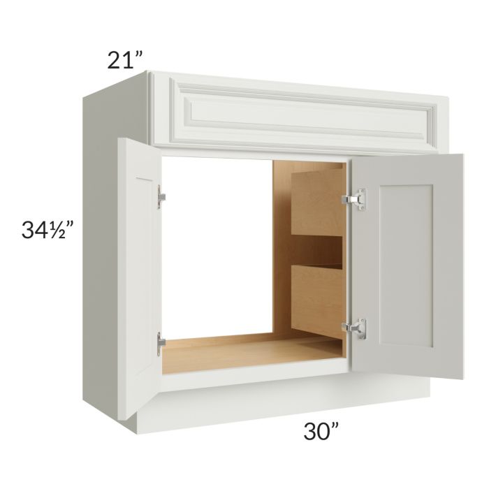 Vanity sink base cabinet with 2 doors on the left, 2 drawers on the right and 1 false drawer front across the top.*Please note sink base and vanity sink base cabinets will not have full backs, vanity sink bases with drawers will only have a full back behind the drawer section(s)*